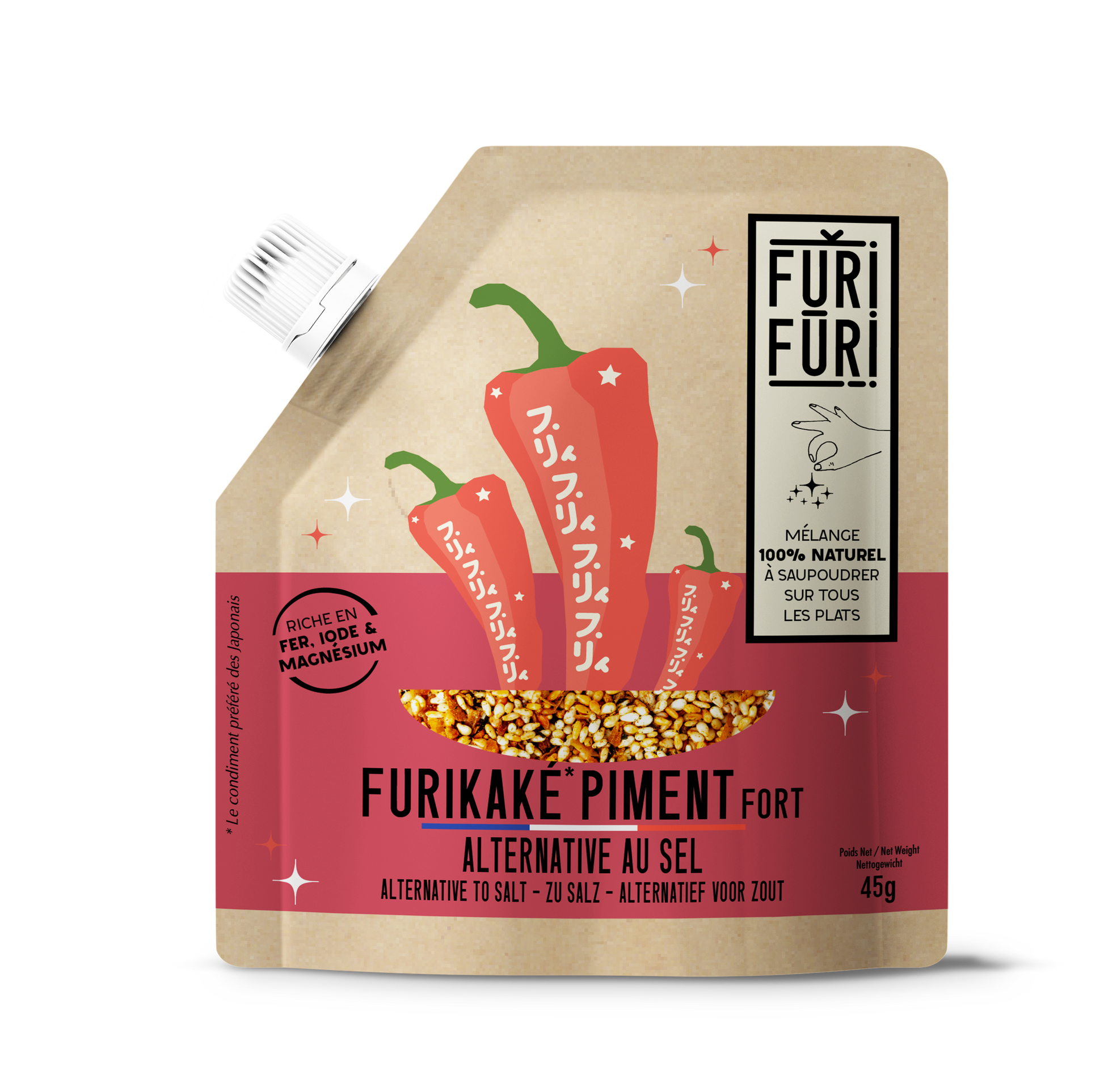 FURIFURI est riche en protéines, fibres, vitamines et minéraux (fer, iode, magnésium) et très facile à utiliser. Il suffit d’en saupoudrer généreusement sur tous ses encas et petits plats, chauds ou froids pour faire le plein d'énergie et booster son système immunitaire.